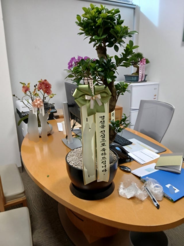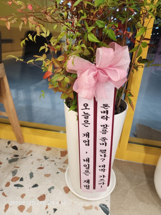 화분에 비해 리본이 너무 작은걸 달아줬어요 화분도 덩달...