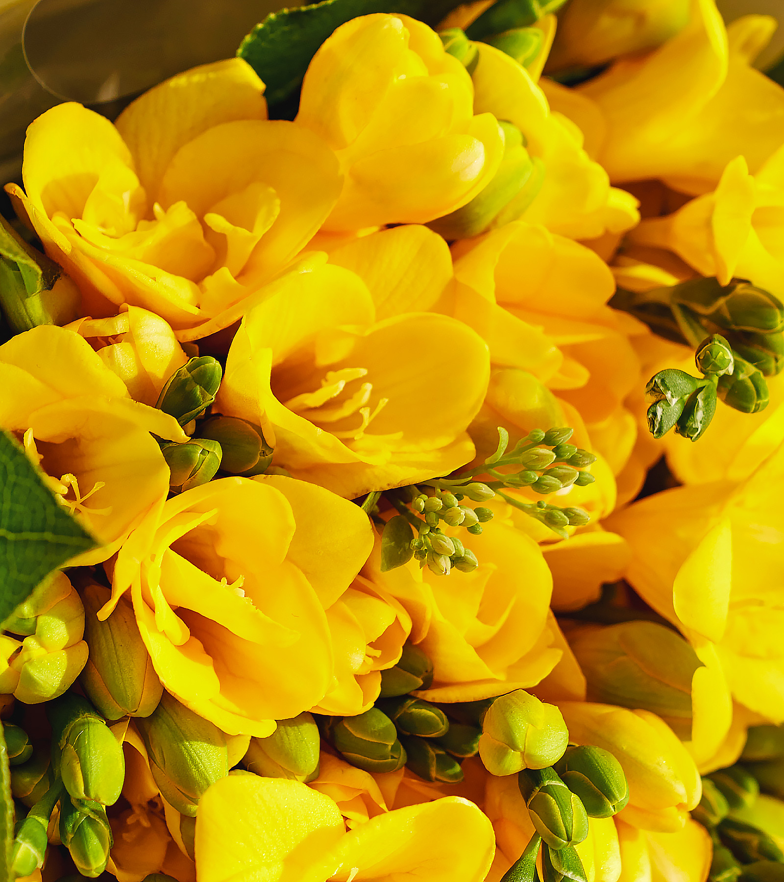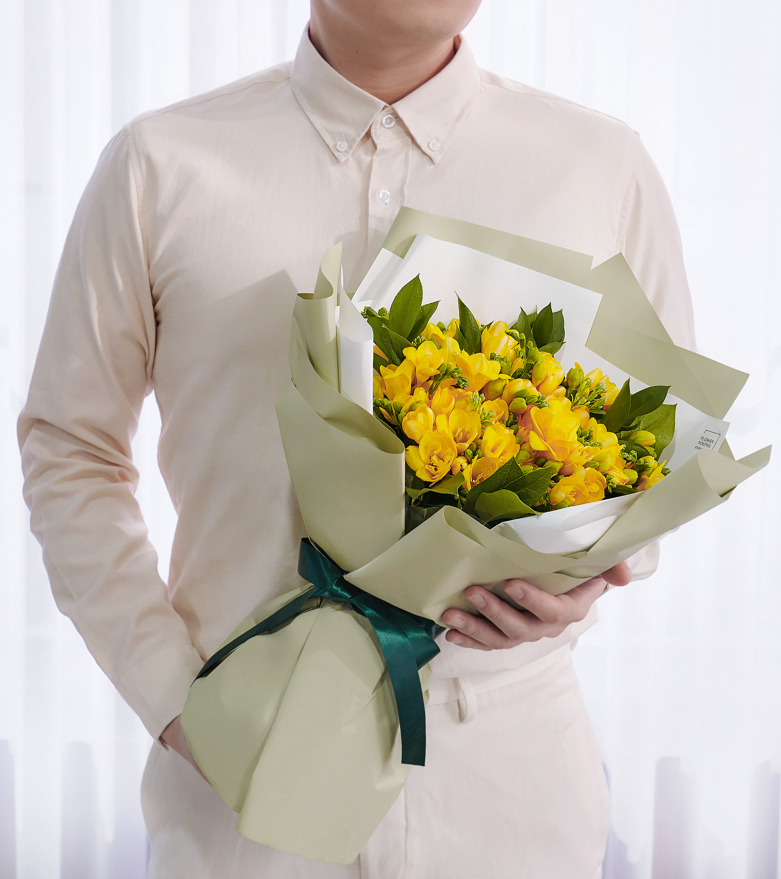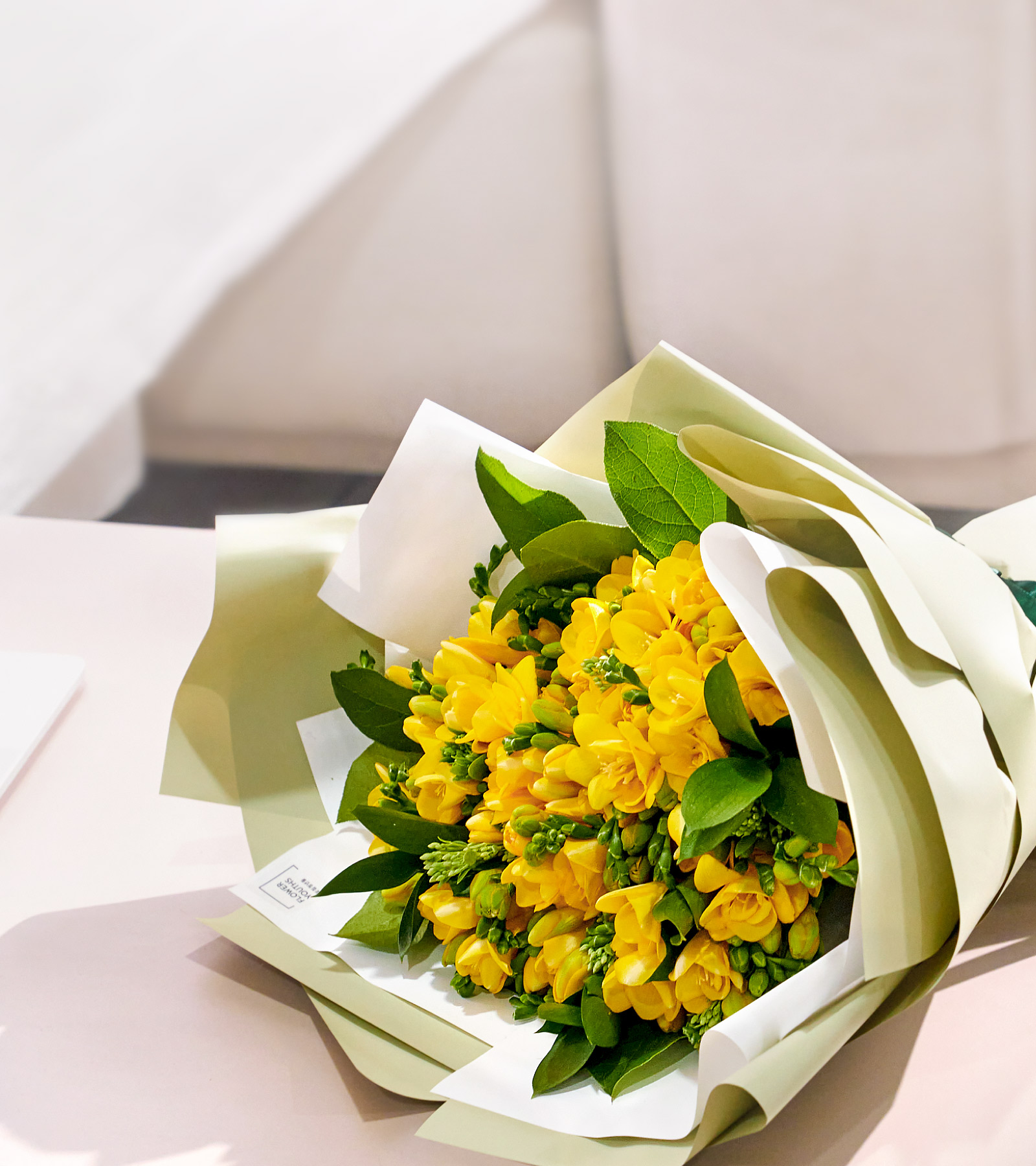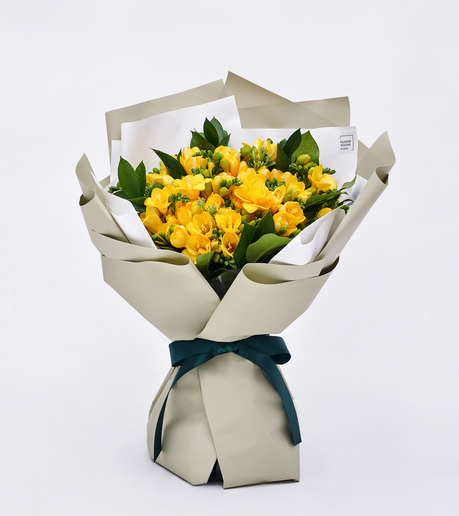 향긋한 봄을 알리는 프리지아로 제작된 노란 빛이 싱그러운 꽃다발입니다.