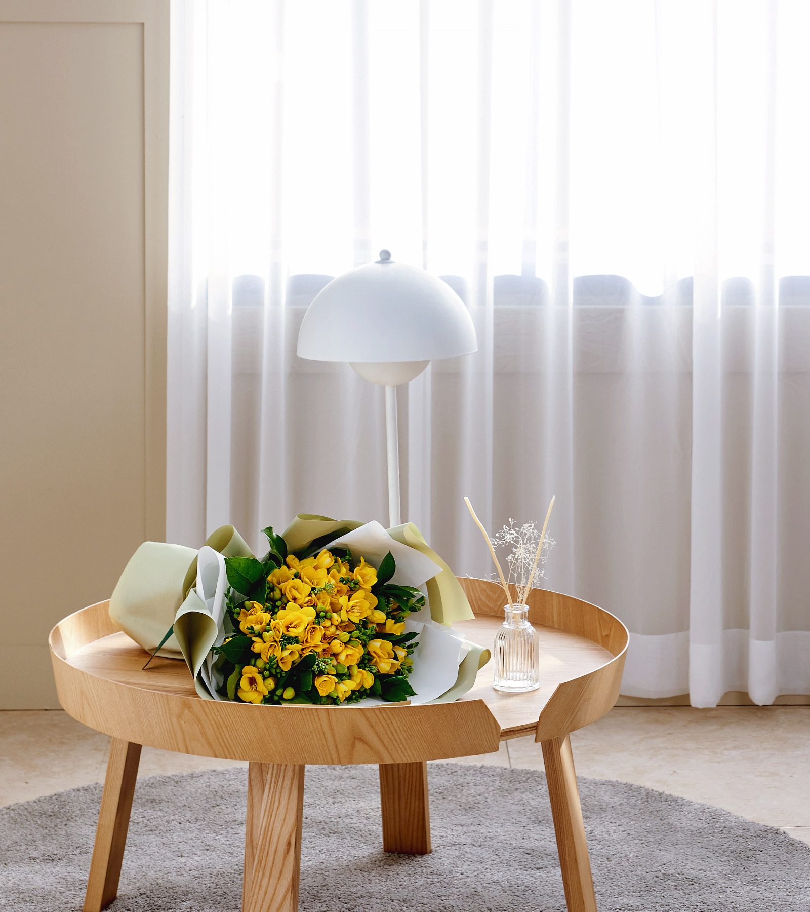 후리지아는 특유의 달콤하면서 은은한 향기가 매력적인 꽃입니다. 노란 후리지아의 꽃말은 ‘천진난만’이라는 뜻을 지니고 있으며 졸업식이나 축하를 전하는 때에 많이 사용되기도 합니다. 새로운 시작을 앞둔 이에게 긍정적인 후리지아의 기운을 선물해 보세요.