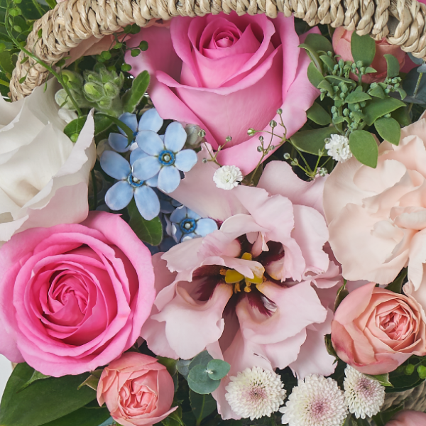 장미, 계절꽃으로 제작하는 분홍 색감의 꽃바구니입니다.